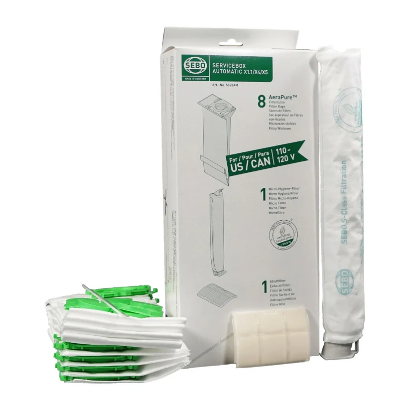 The SEBO X4/X5-series Service Box includes 8 AeraPureâ„¢ filter bags, a pre-motor microfilter, an exhaust filter, and a sealing strip. The electrostatically charged filter bags capture dust as the first stage of anti-allergy filtration. The pre-motor microfilter protects the motor by capturing fine dust, while the exhaust filter traps any remaining microscopic particles. Included with these, the sealing strip prevents debris kickback on hard floors.